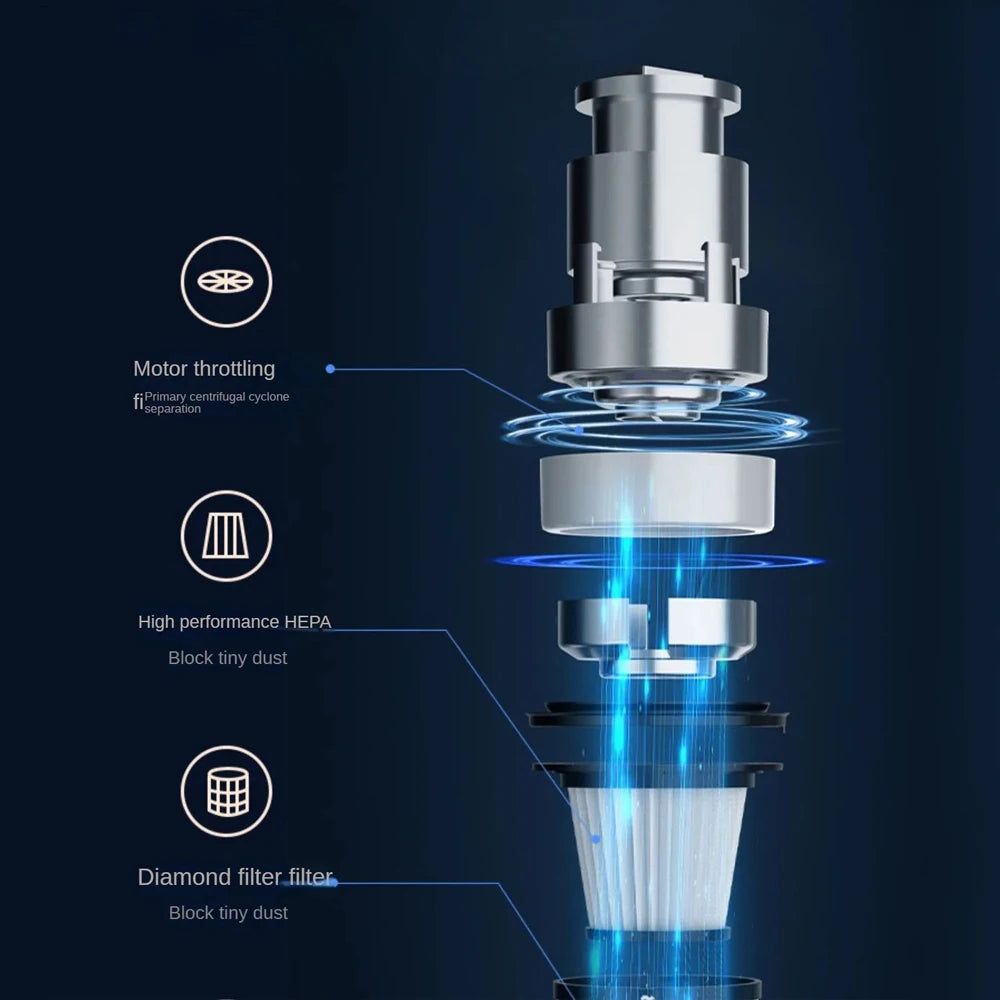 1. This wireless vacuum cleaner has a super suction power of 6500Pa, adopts quadruple high-efficiency filtration, and multiple sets of brush heads for cleaning. It is very easy for you to clean your home or the car.